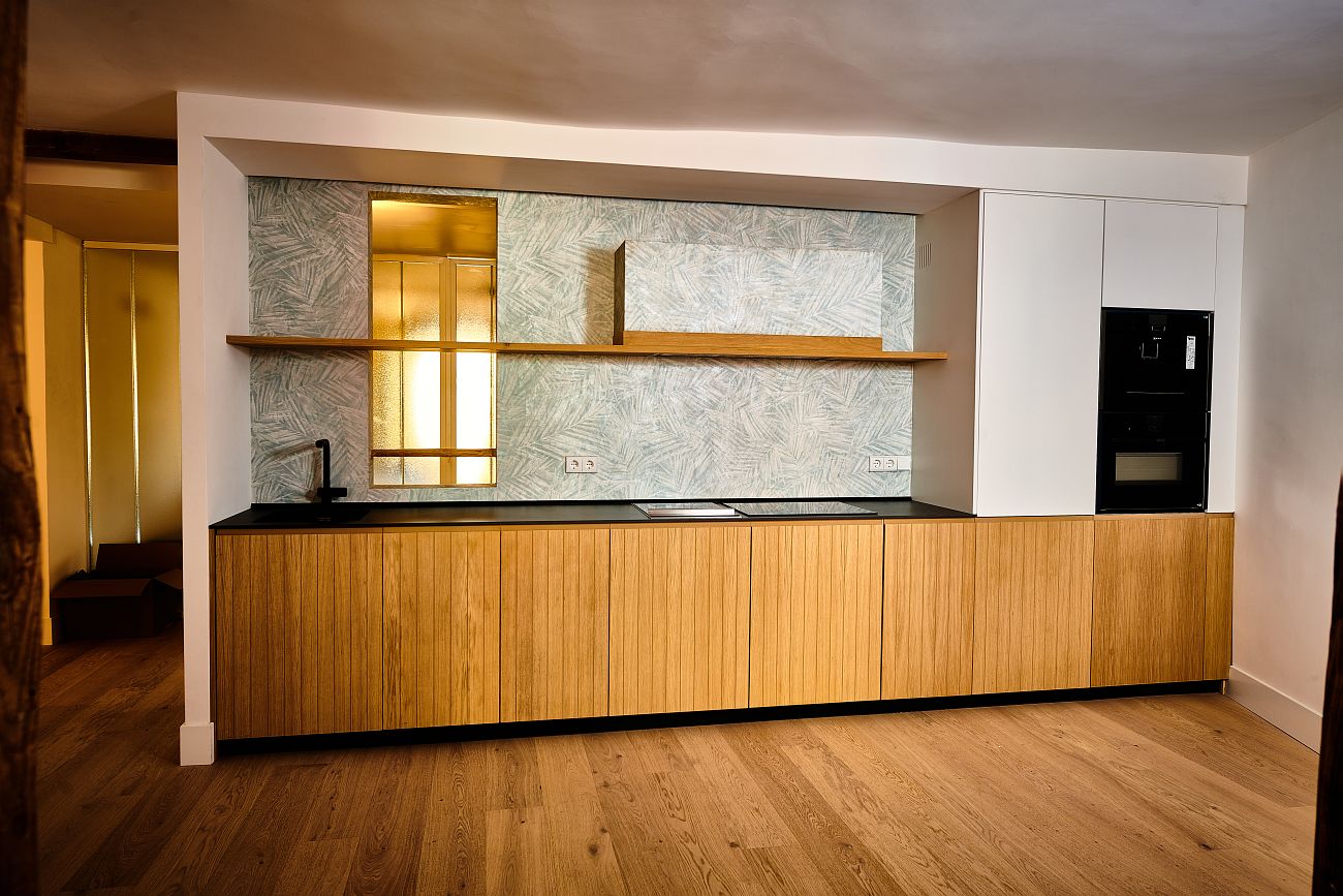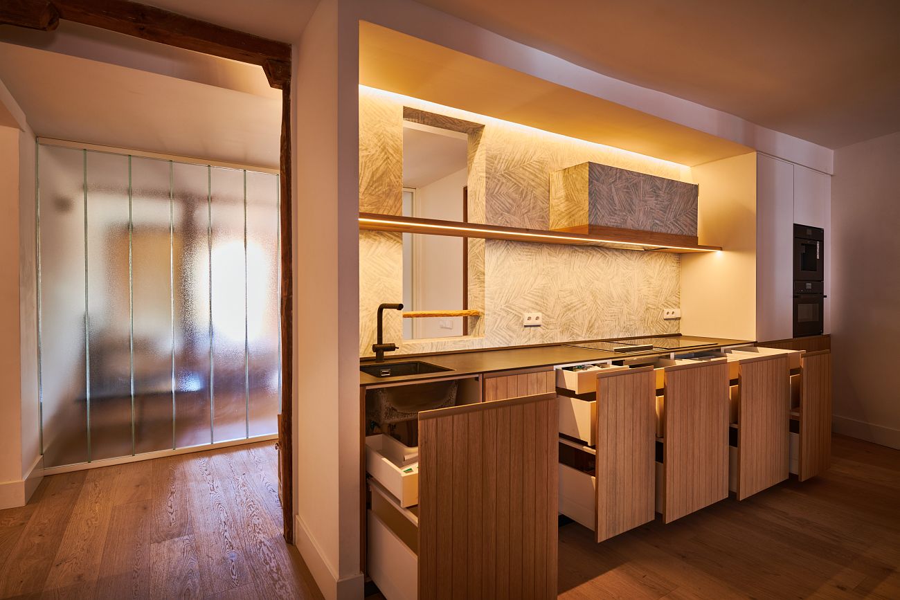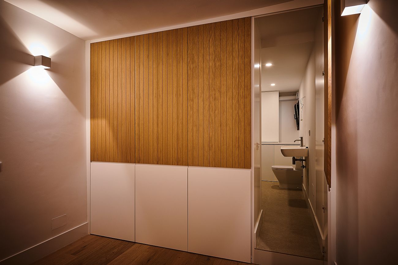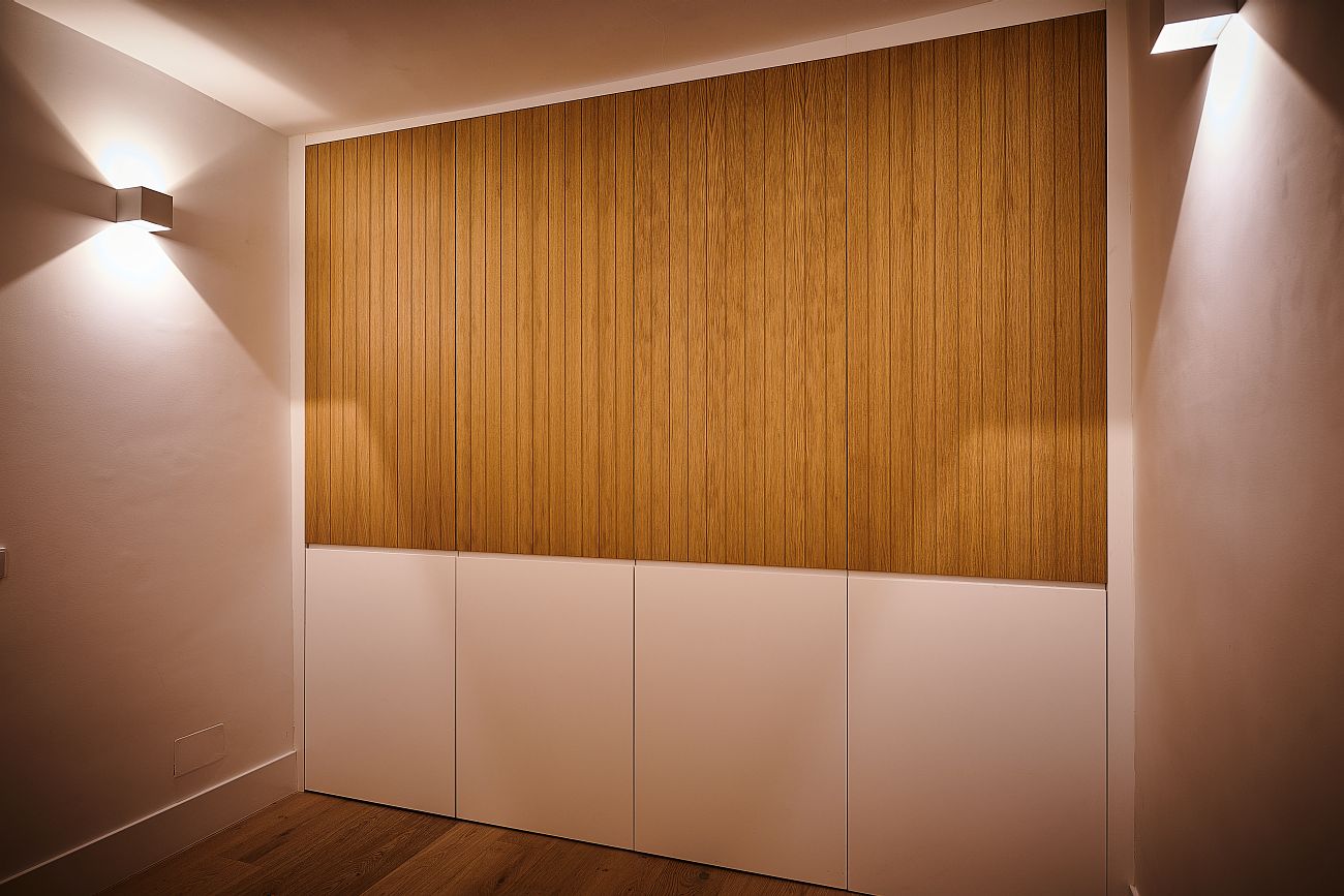 La elección de materiales ha sido clave: la madera de roble aporta calidez y carácter, mientras que las puertas lacadas en blanco generan contraste