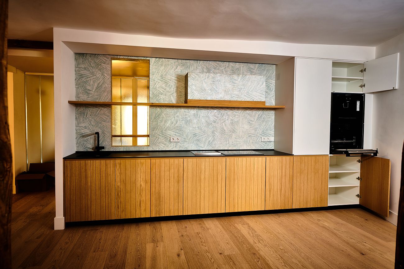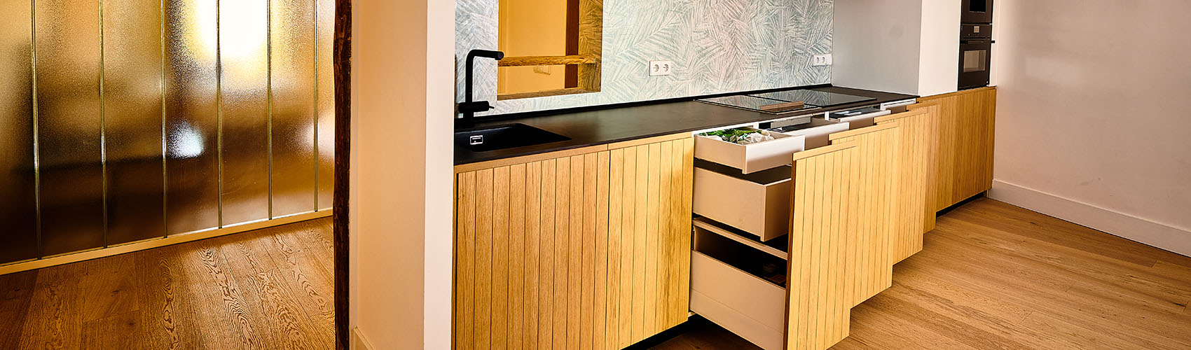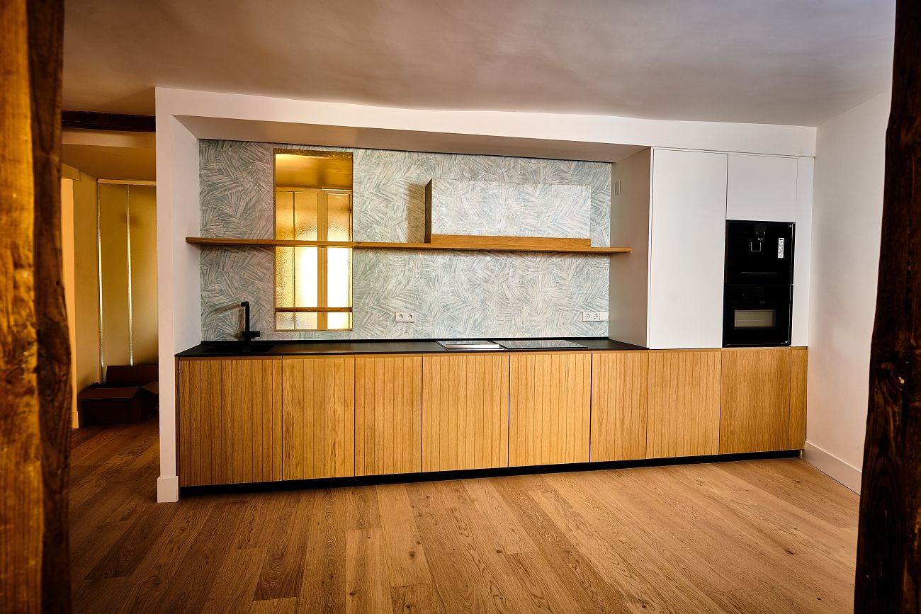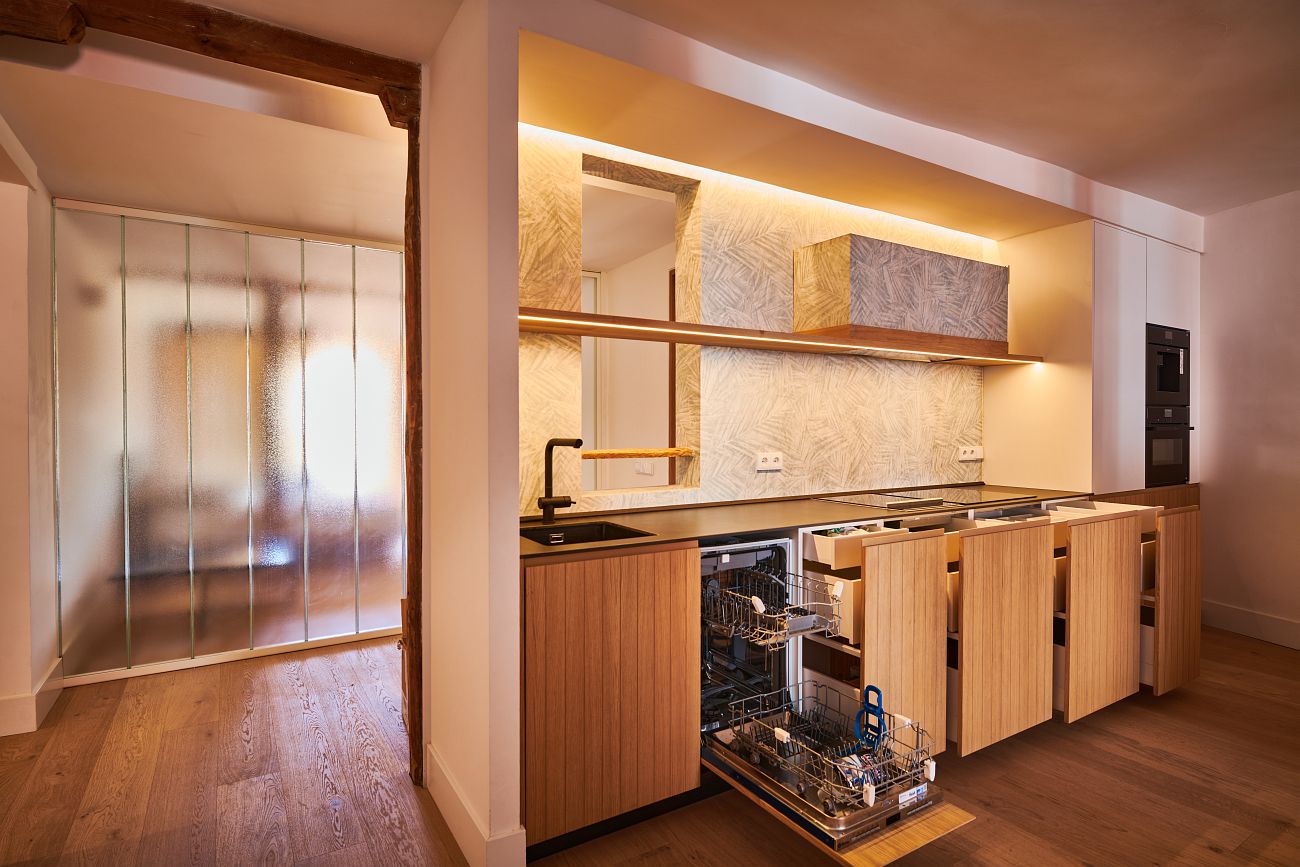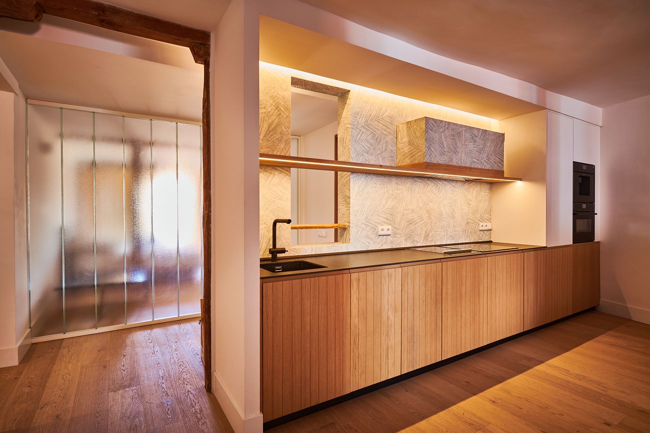La elección de materiales ha sido clave: la madera de roble aporta calidez y carácter, mientras que las puertas lacadas en blanco generan contraste