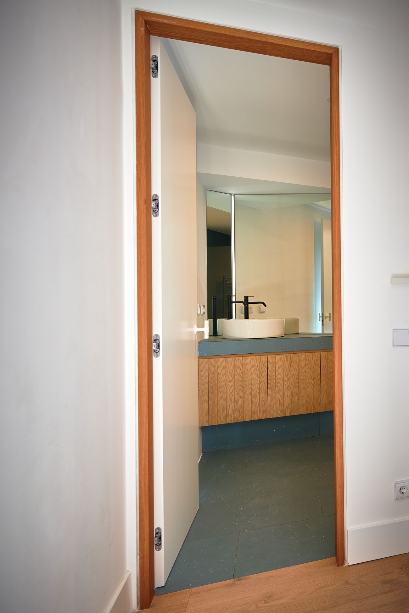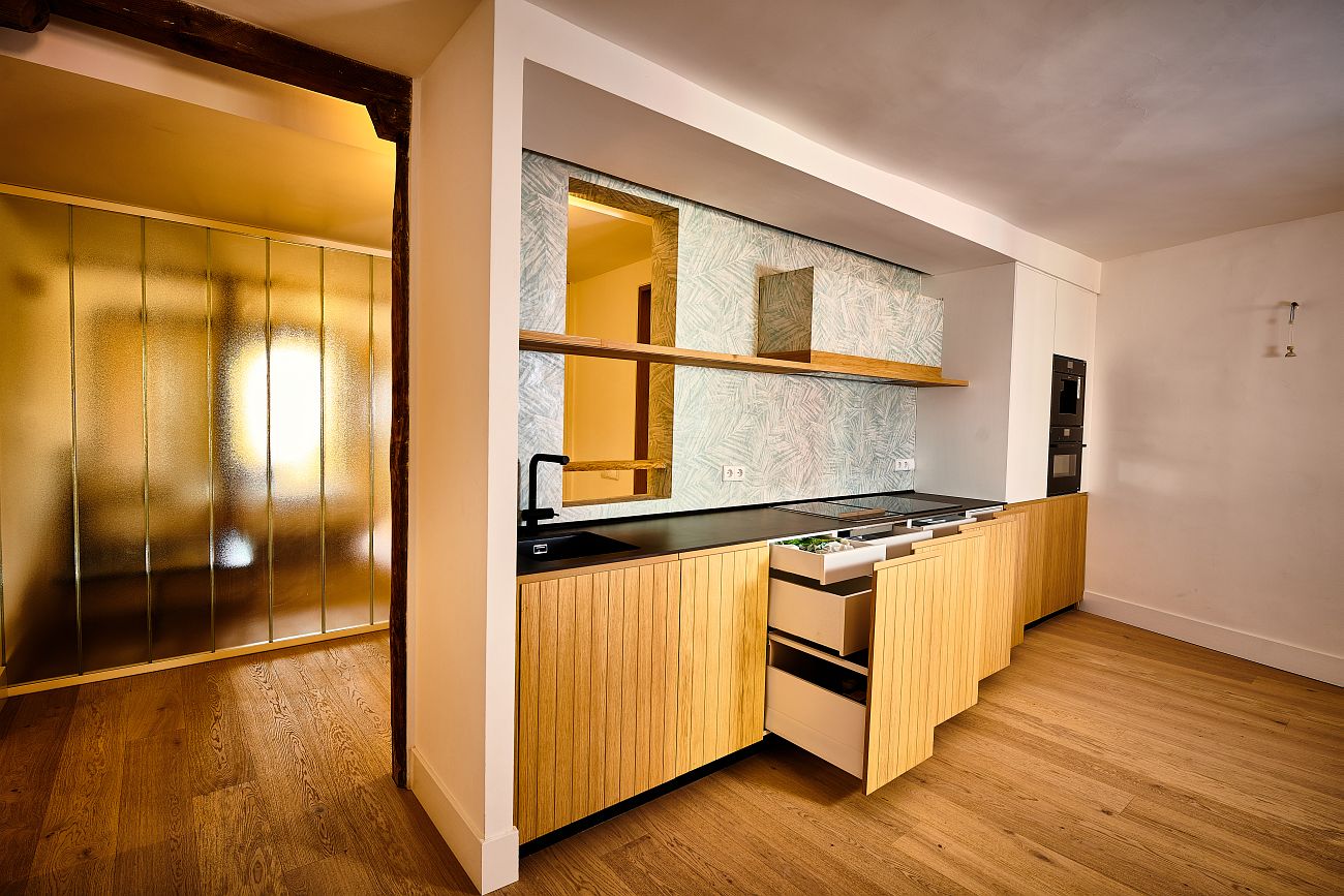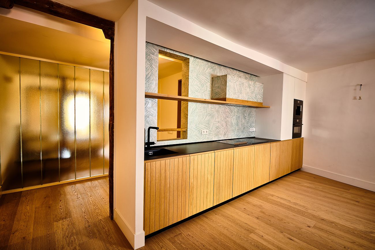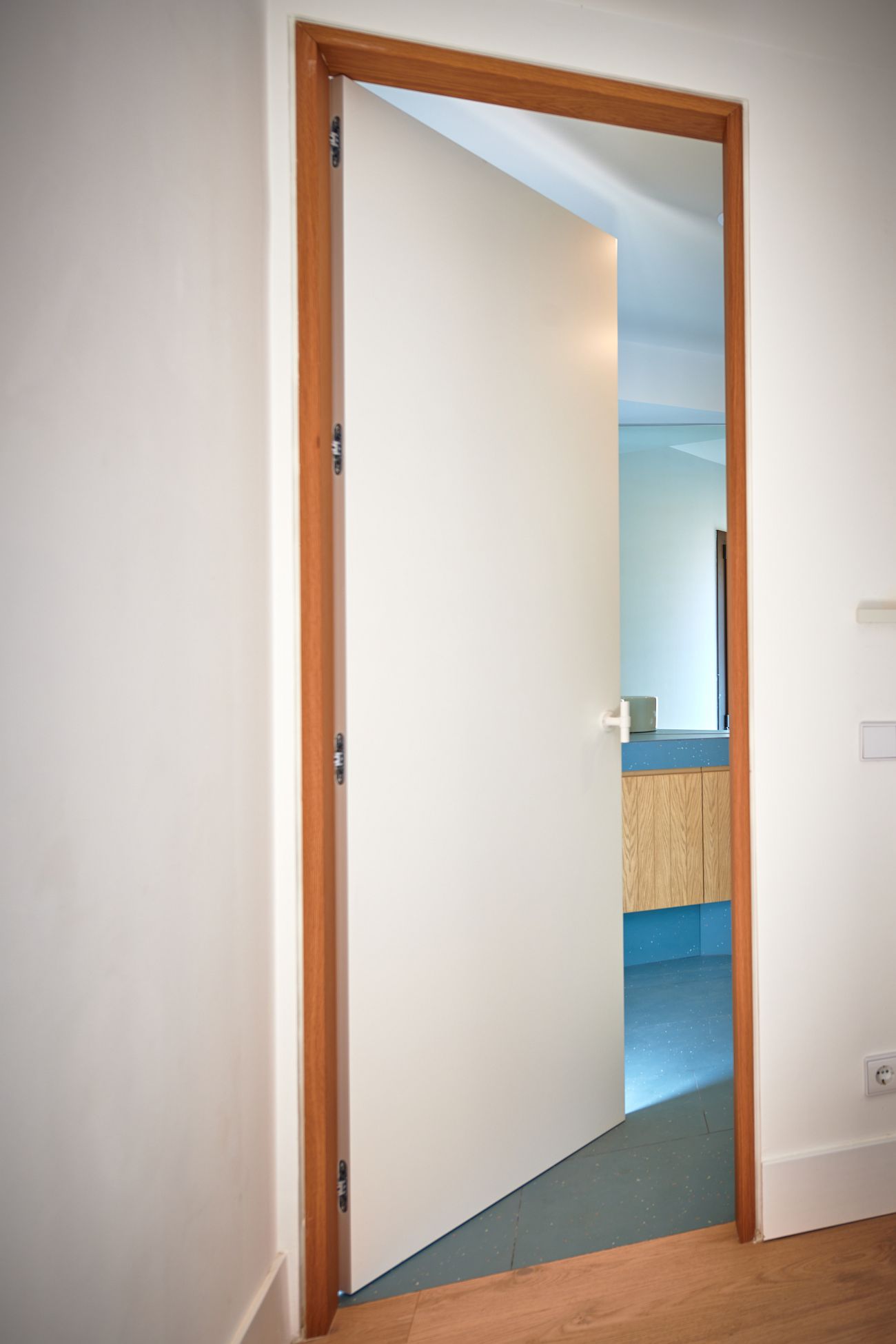 La elección de materiales ha sido clave: la madera de roble aporta calidez y carácter, mientras que las puertas lacadas en blanco generan contraste