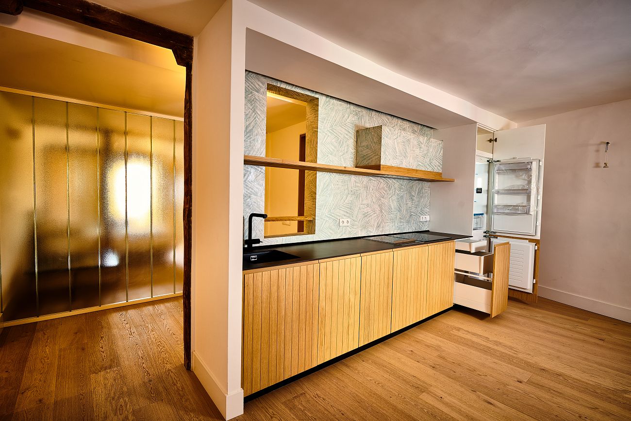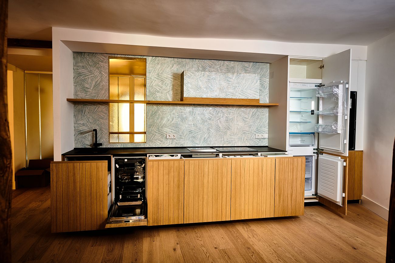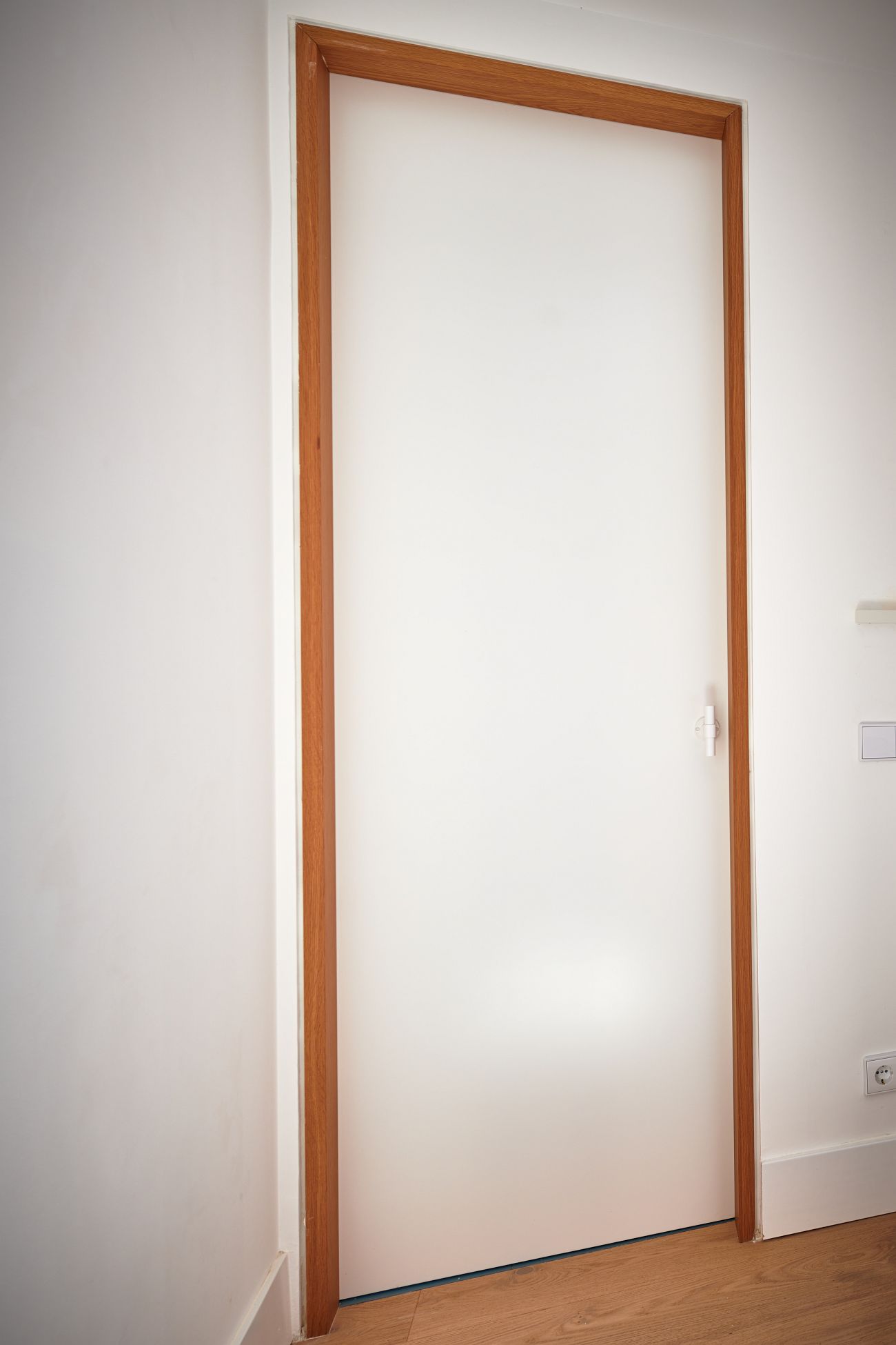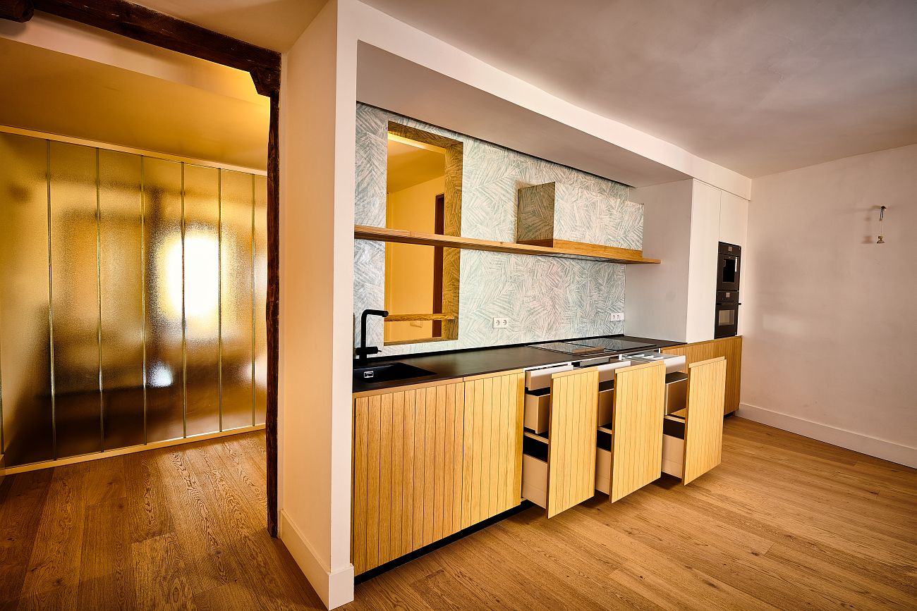 La elección de materiales ha sido clave: la madera de roble aporta calidez y carácter, mientras que las puertas lacadas en blanco generan contraste