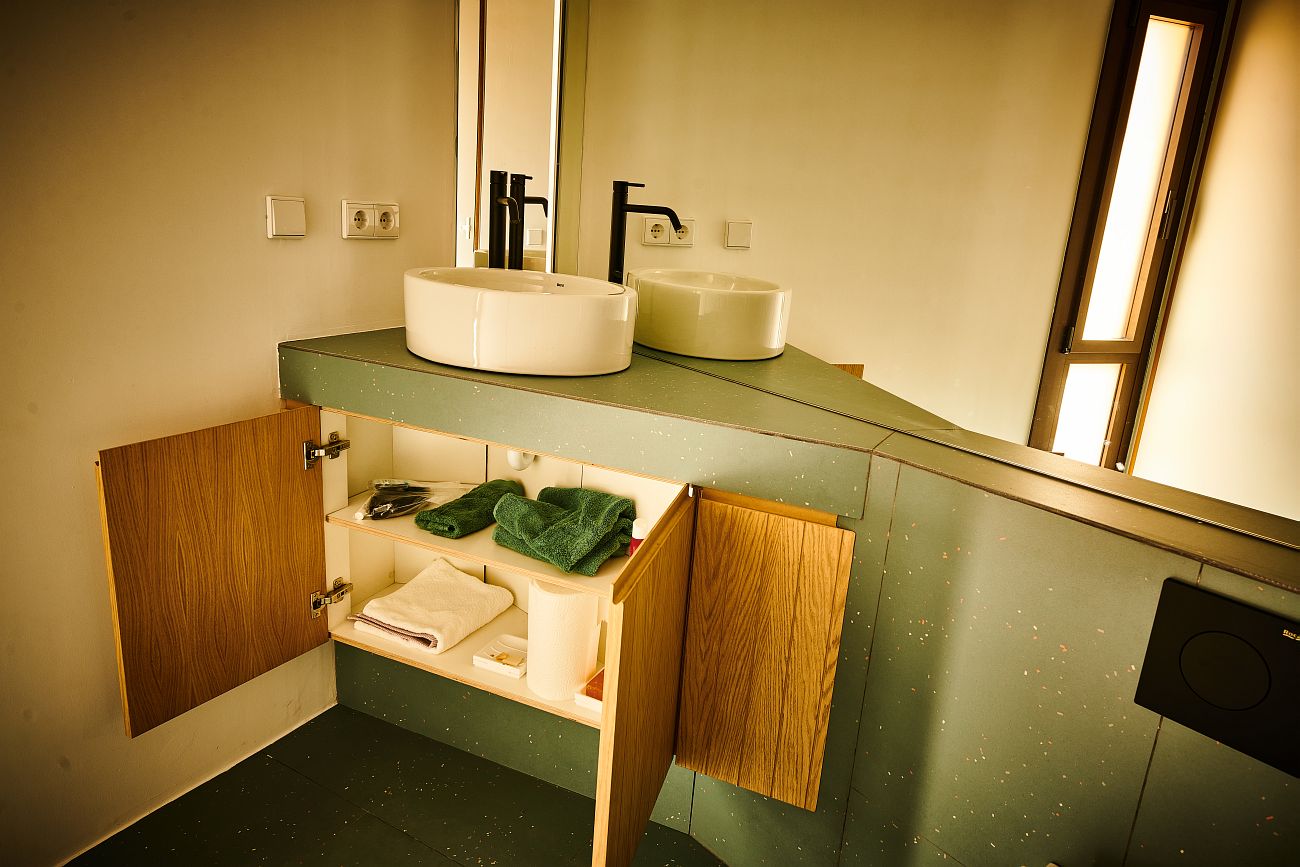 Uno de los aspectos más singulares de este proyecto es el uso de formas asimétricas en el diseño del mobiliario a medida.