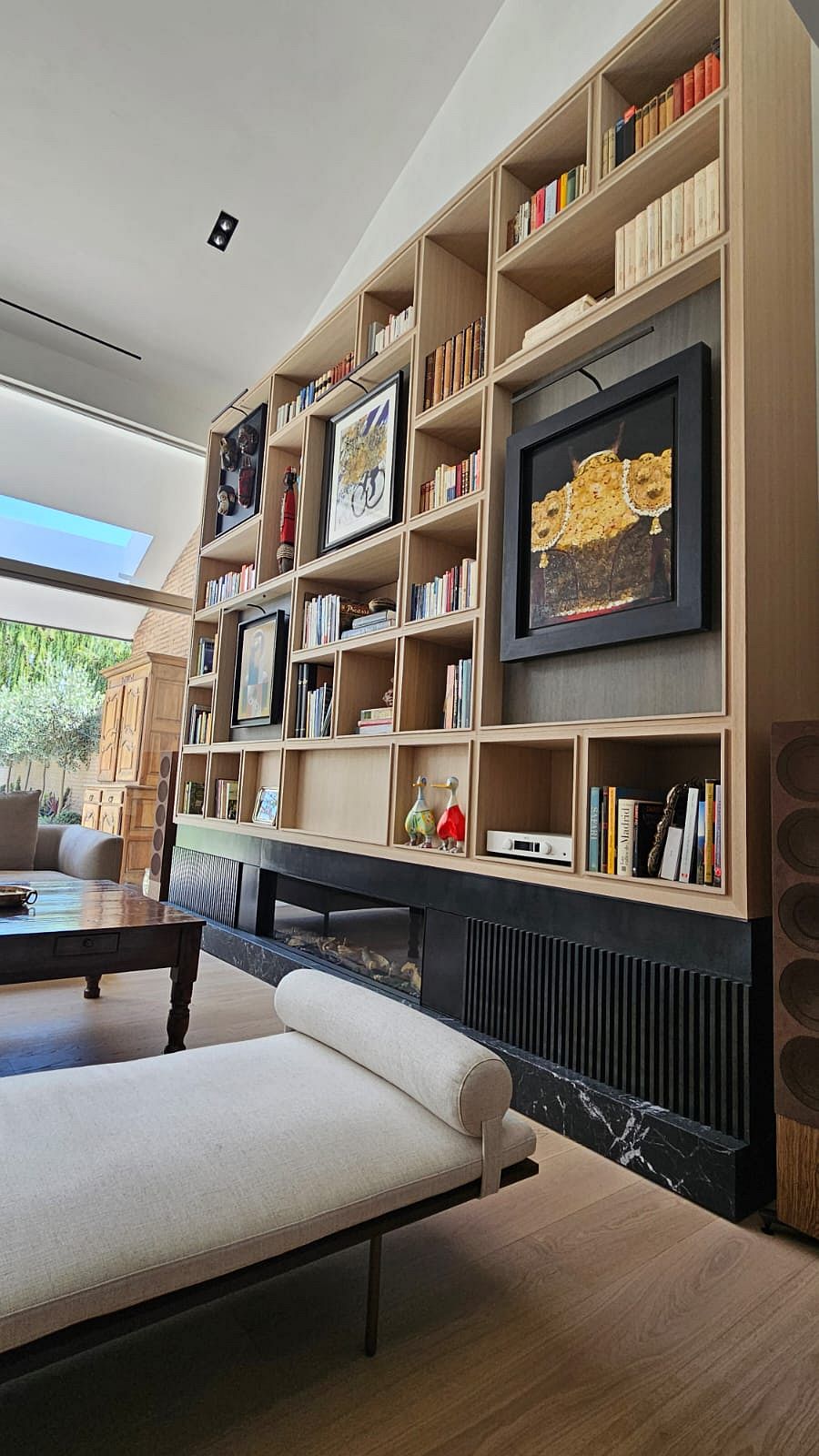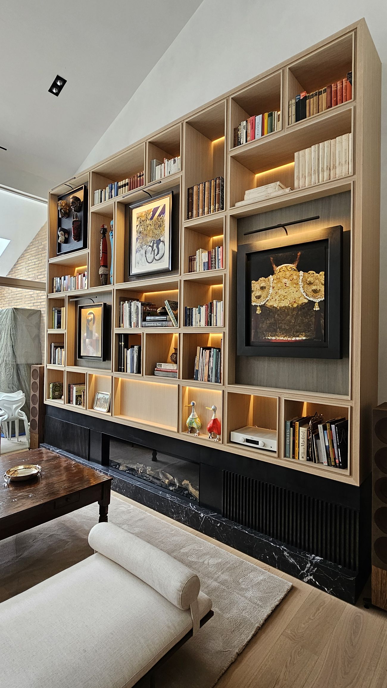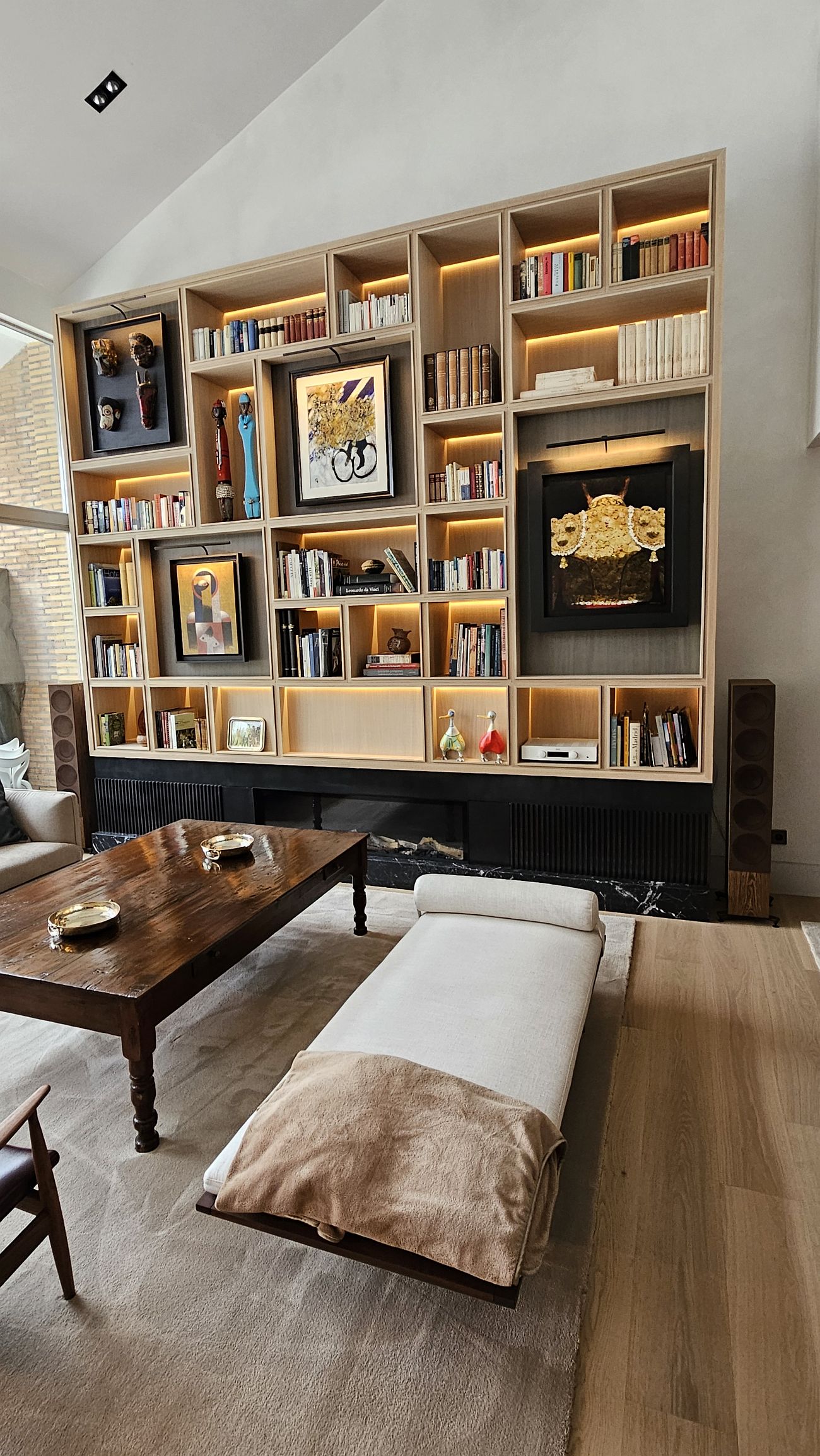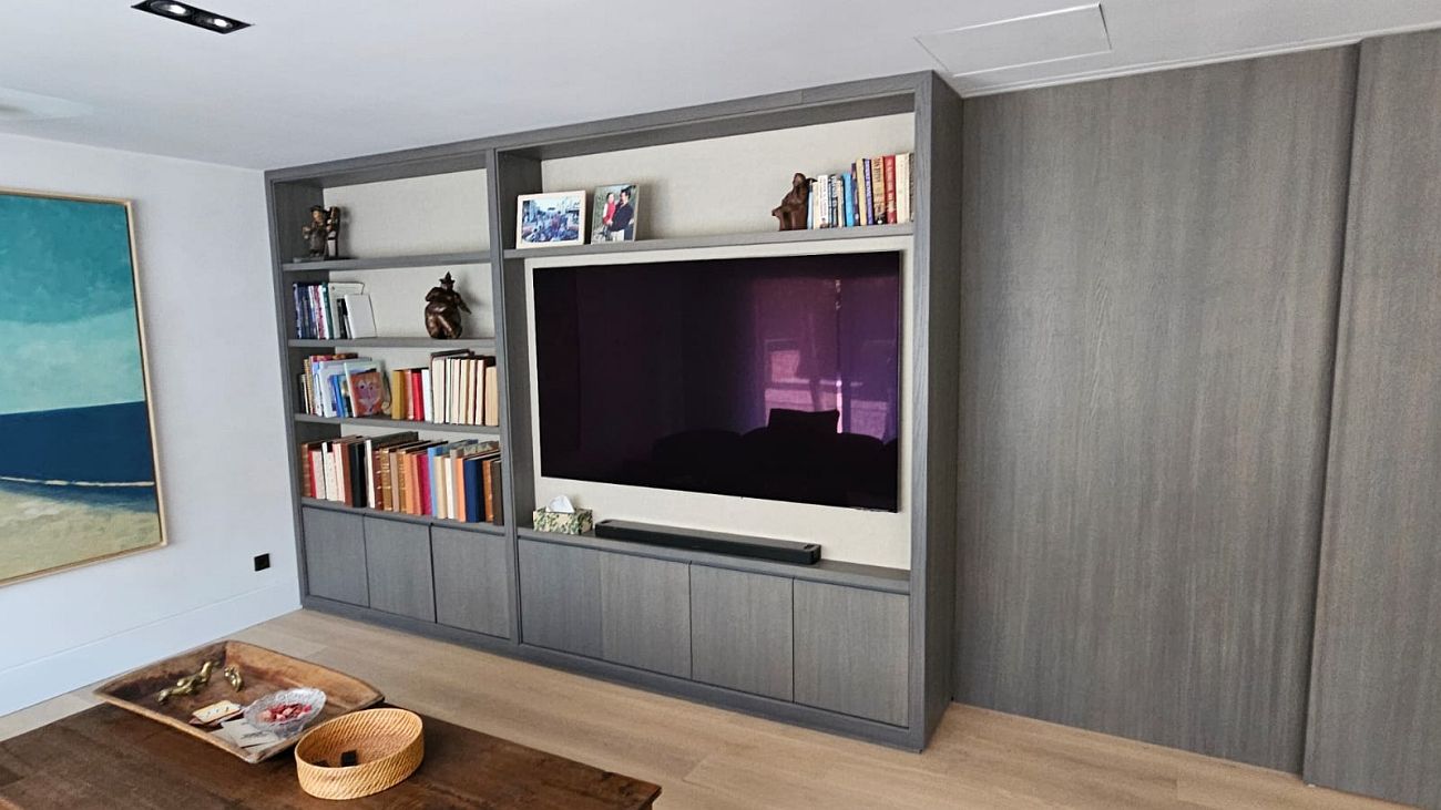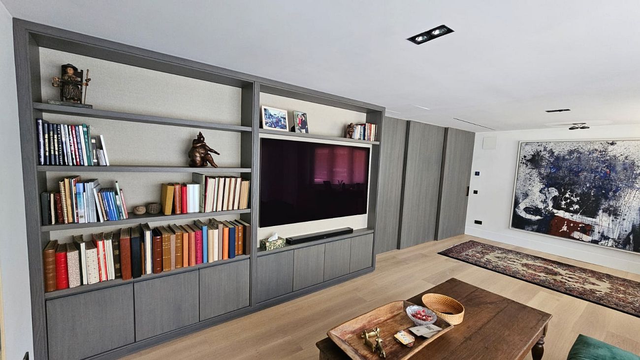 bibliotecas a medida en los salones, grandes módulos de almacenaje, y detalles integrados en techos y paredes que dan cohesión al conjunto.