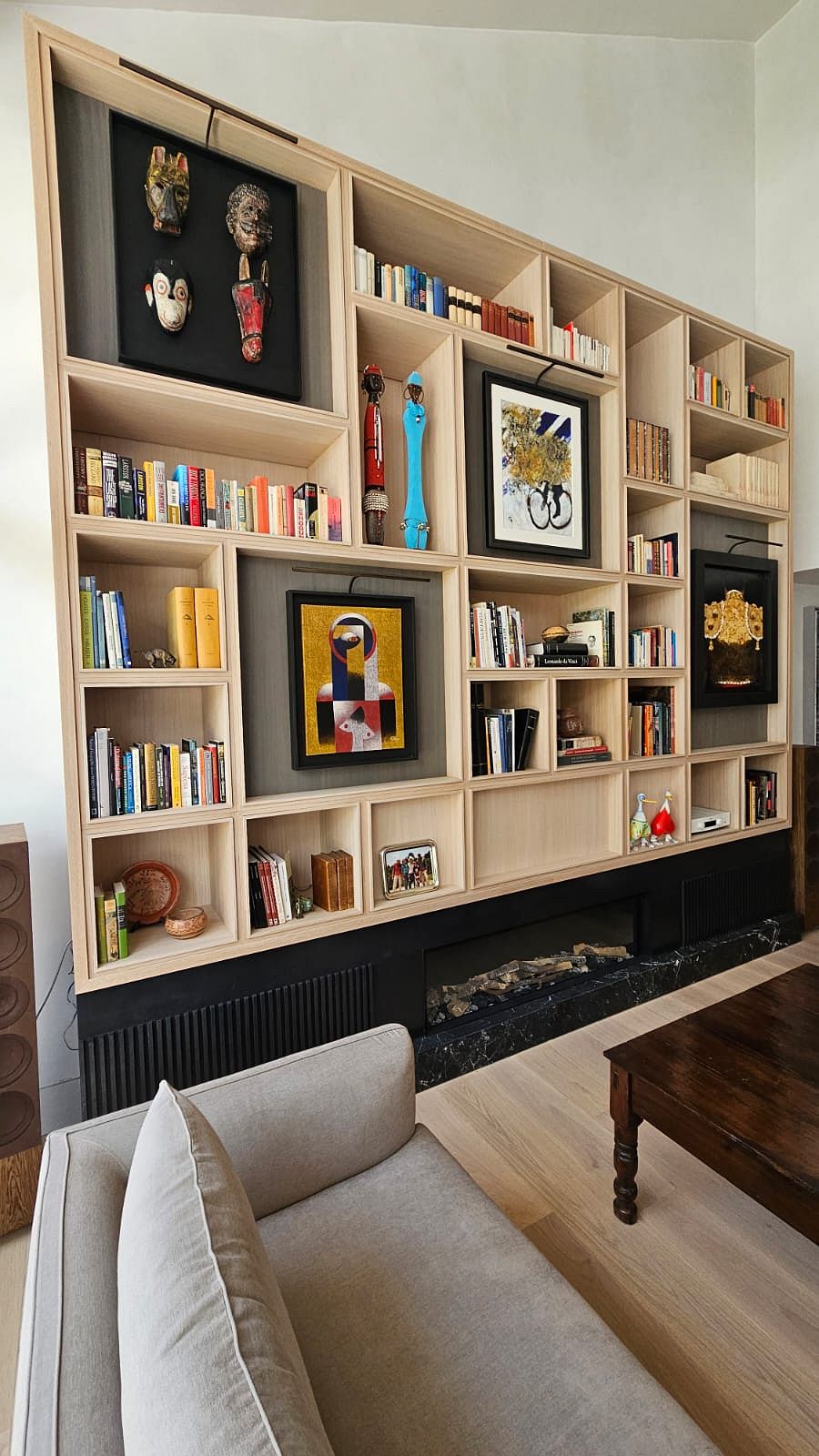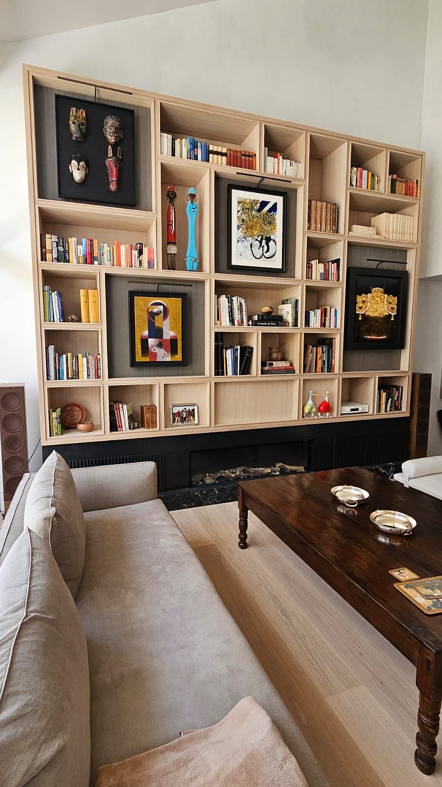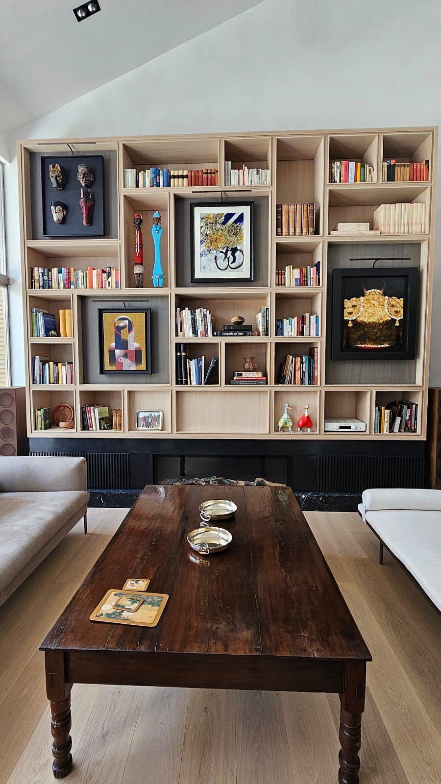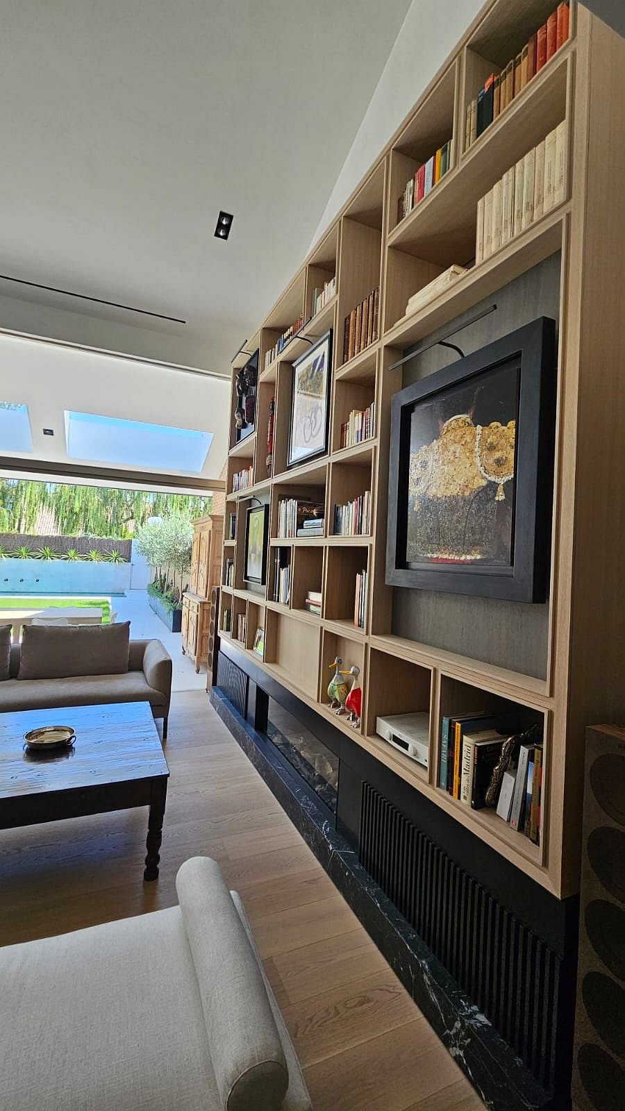 bibliotecas a medida en los salones, grandes módulos de almacenaje, y detalles integrados en techos y paredes que dan cohesión al conjunto.