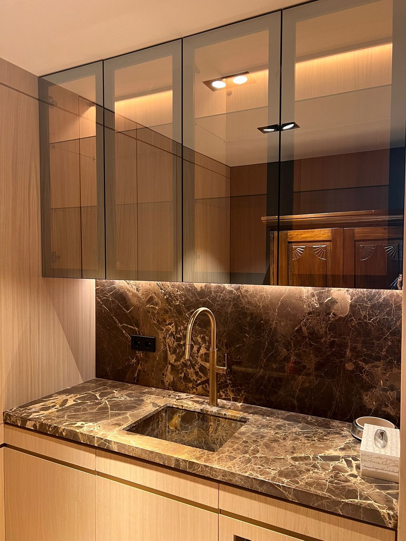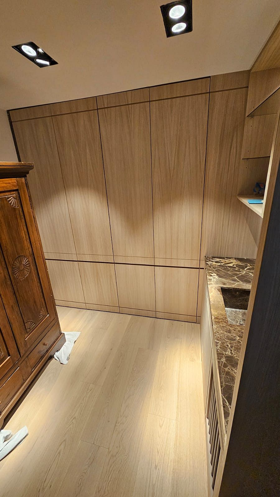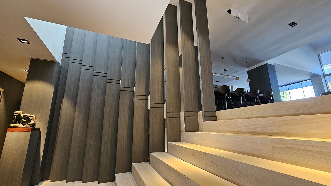 tiradas de chapa natural. Esta elección permitió mantener una continuidad cromática perfecta en todos los panelados de madera, evitando variaciones de tono y