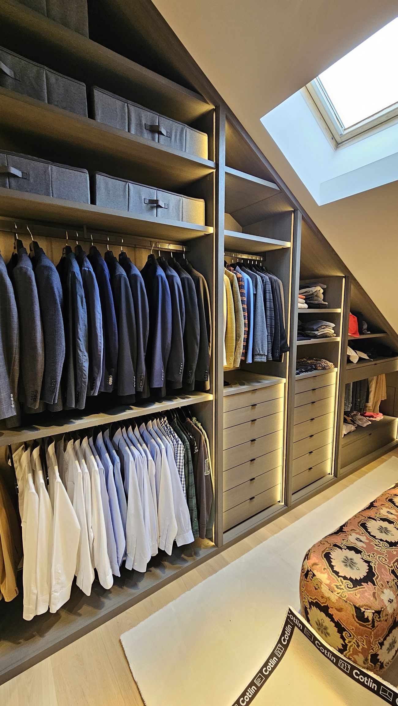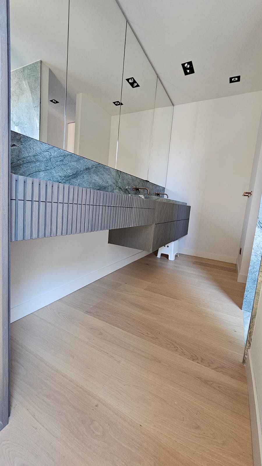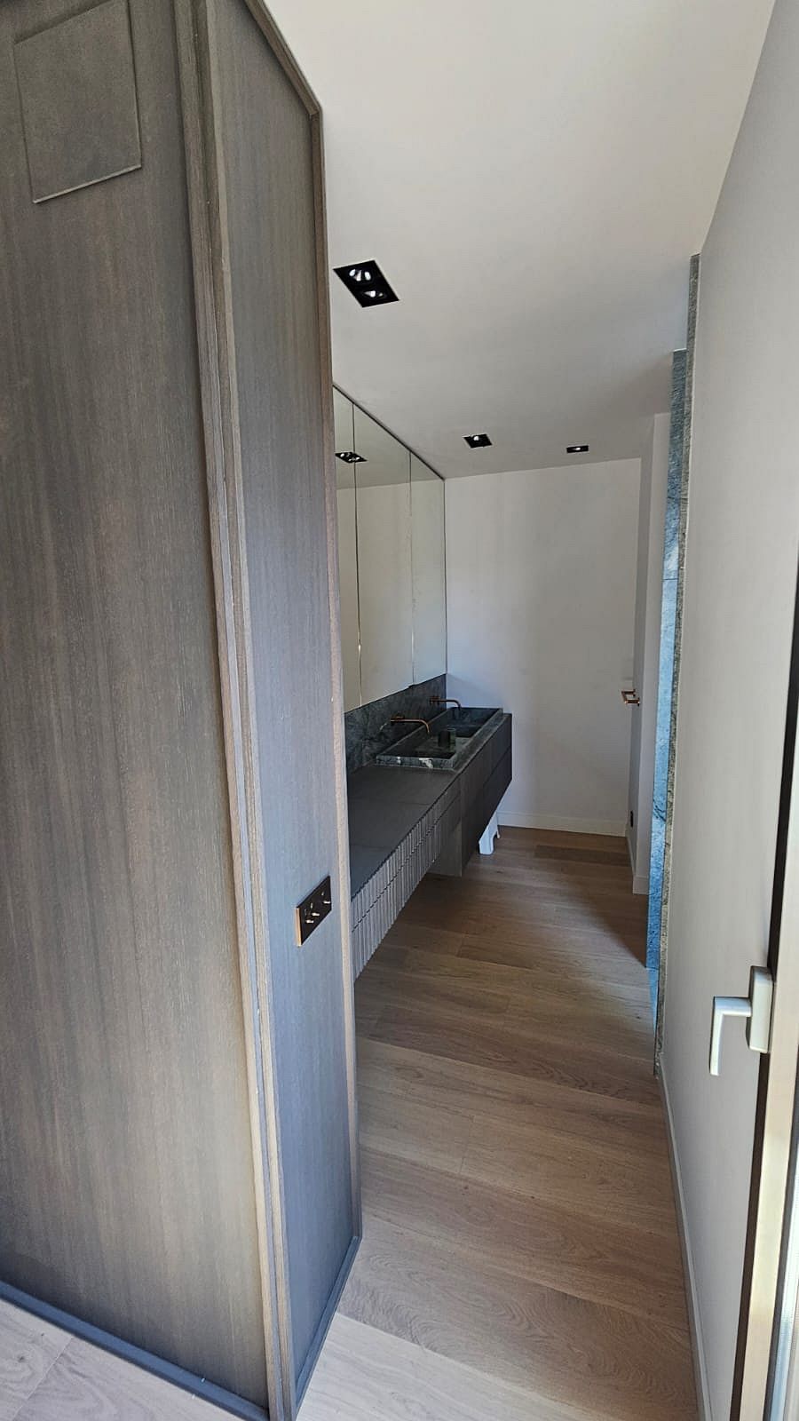 tiradas de chapa natural. Esta elección permitió mantener una continuidad cromática perfecta en todos los panelados de madera, evitando variaciones de tono y