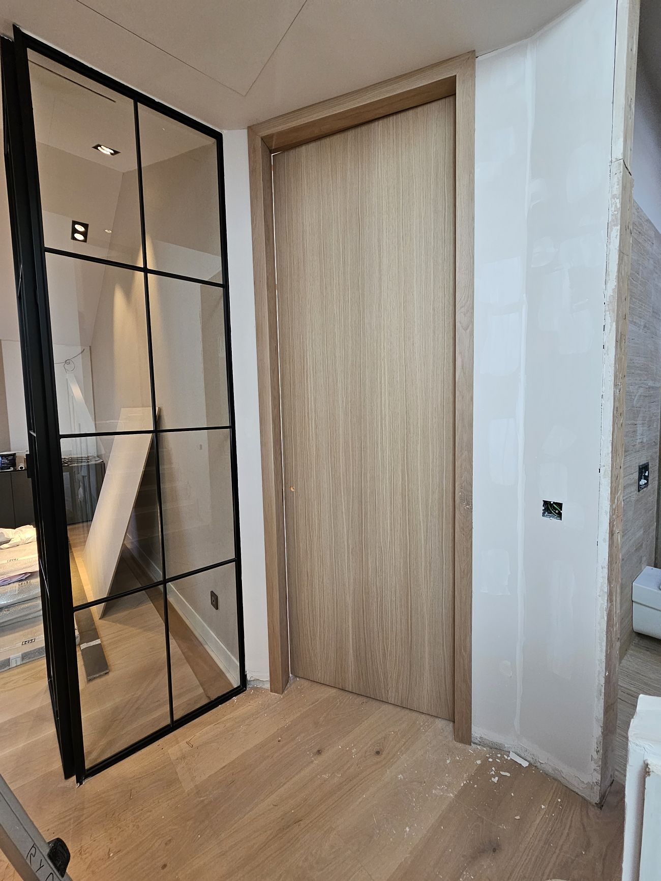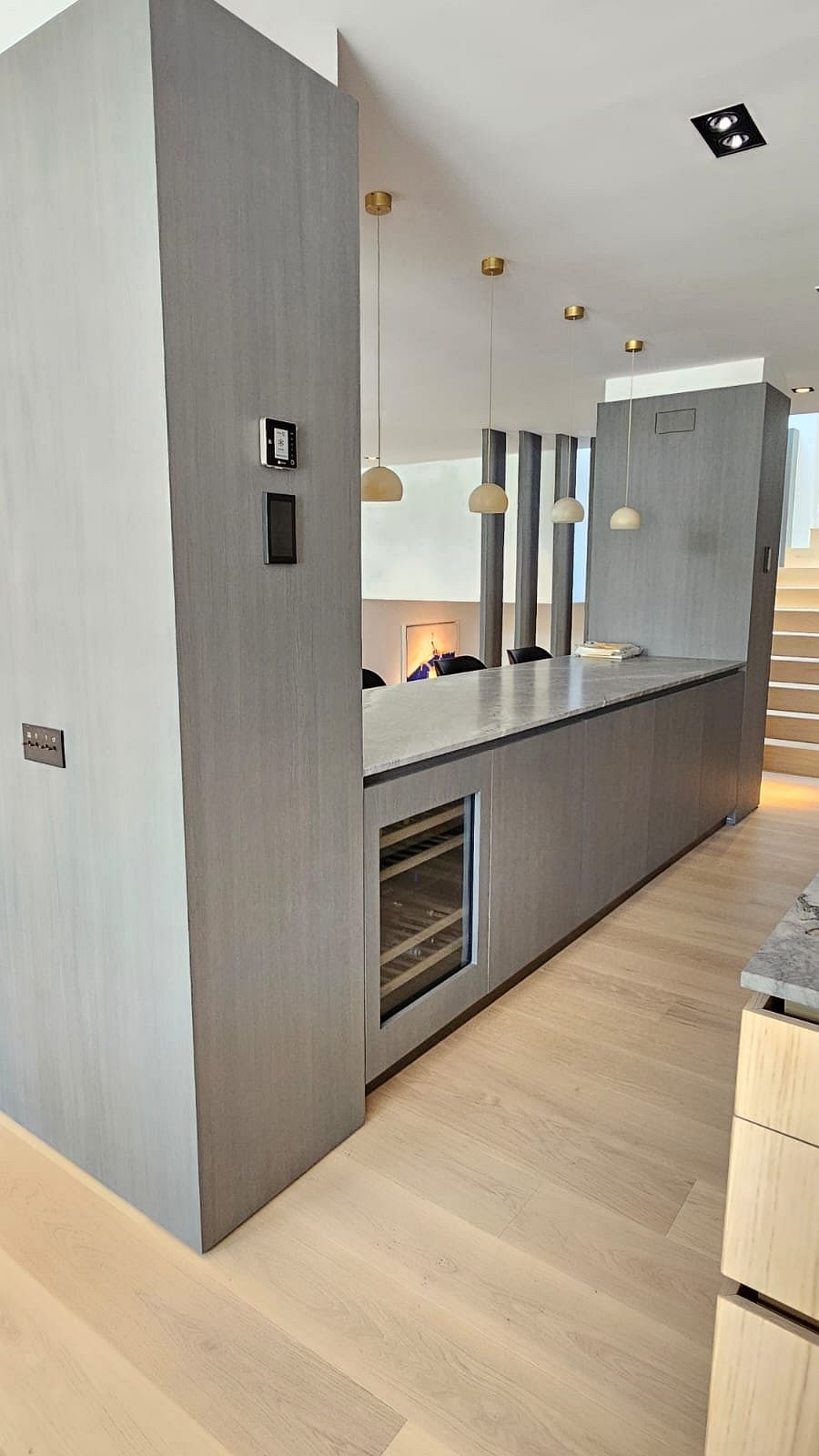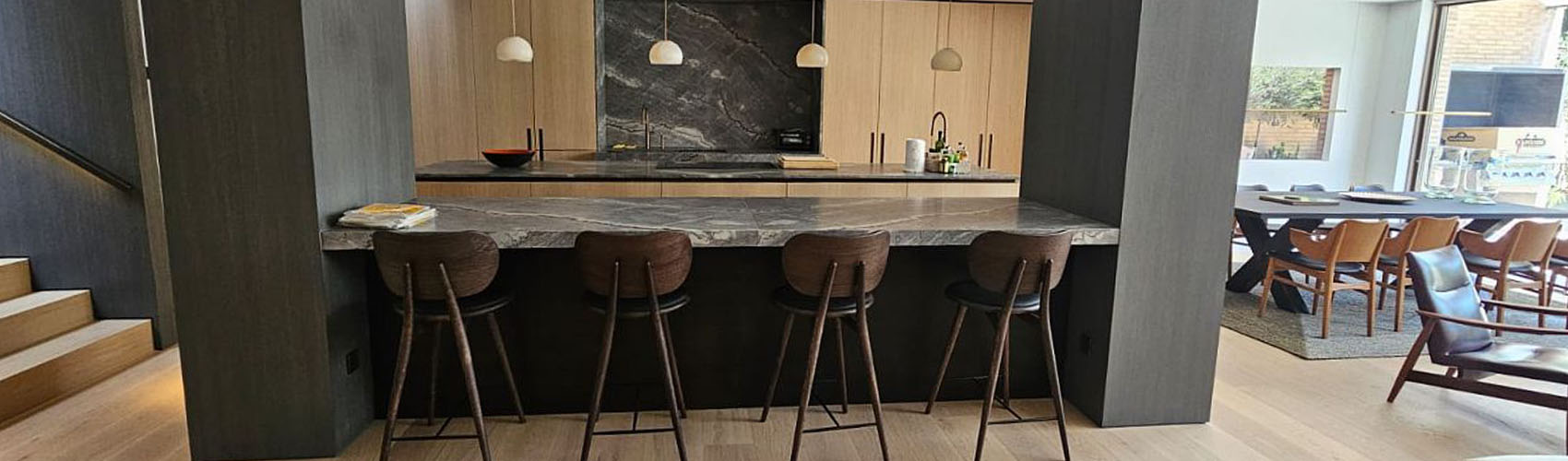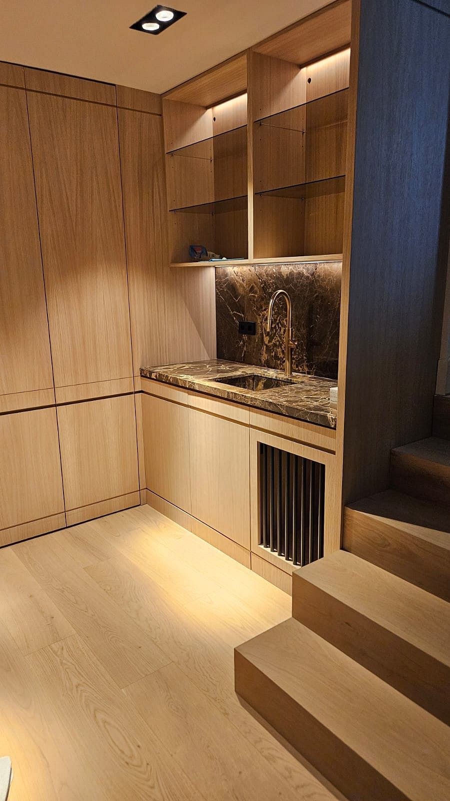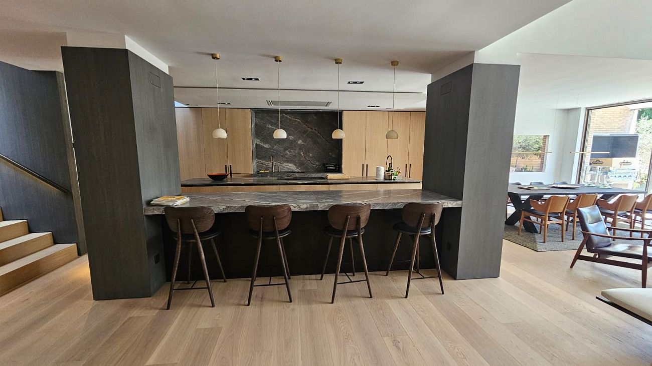 Desde el primer momento, la carpintería a medida fue clave para lograr la personalidad única de esta vivienda. Se trabajó con madera de roble rechapada, seleccionada cuidadosamente en