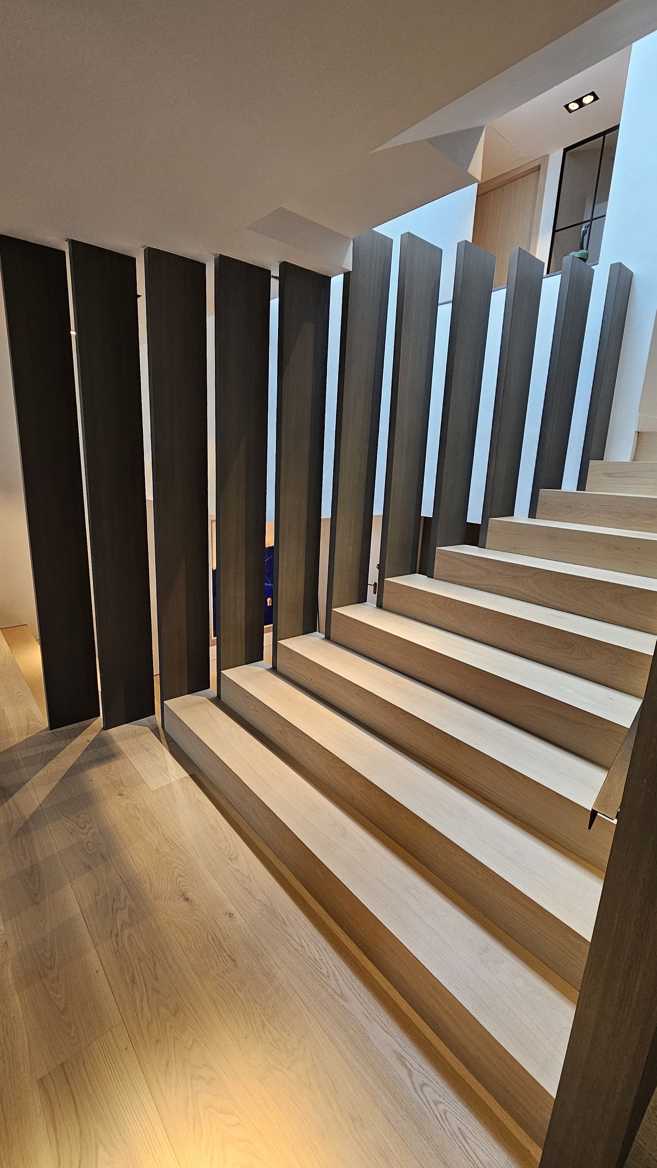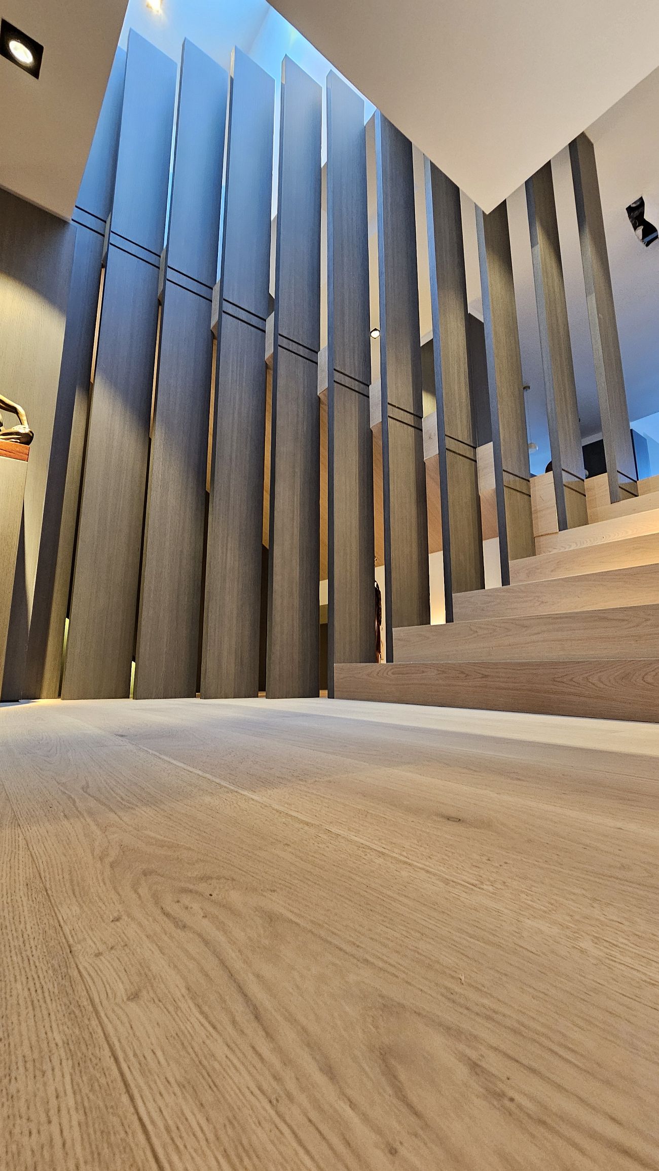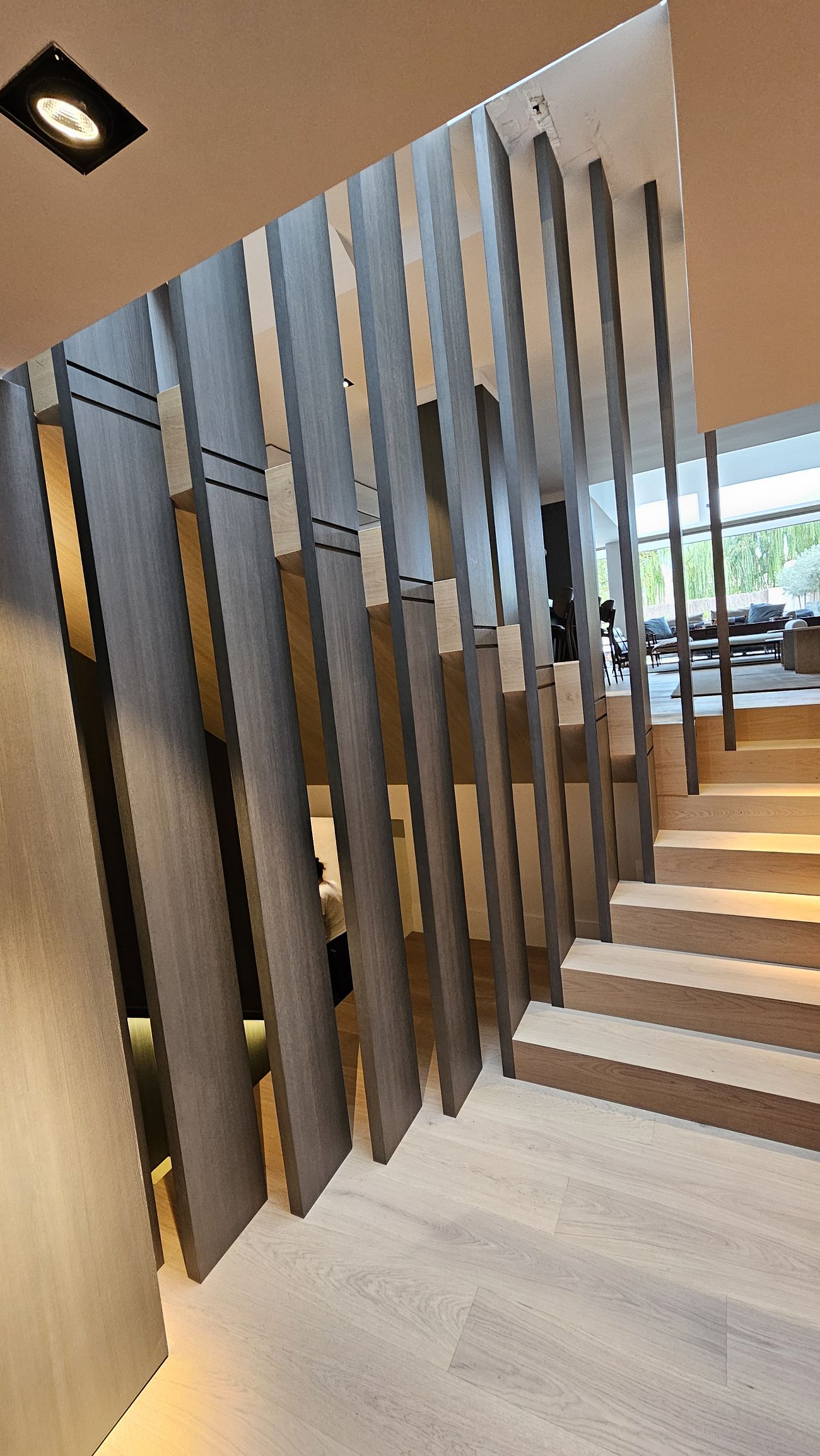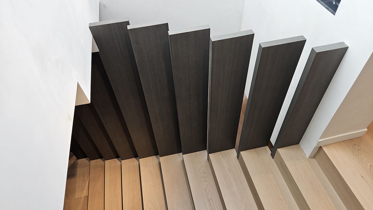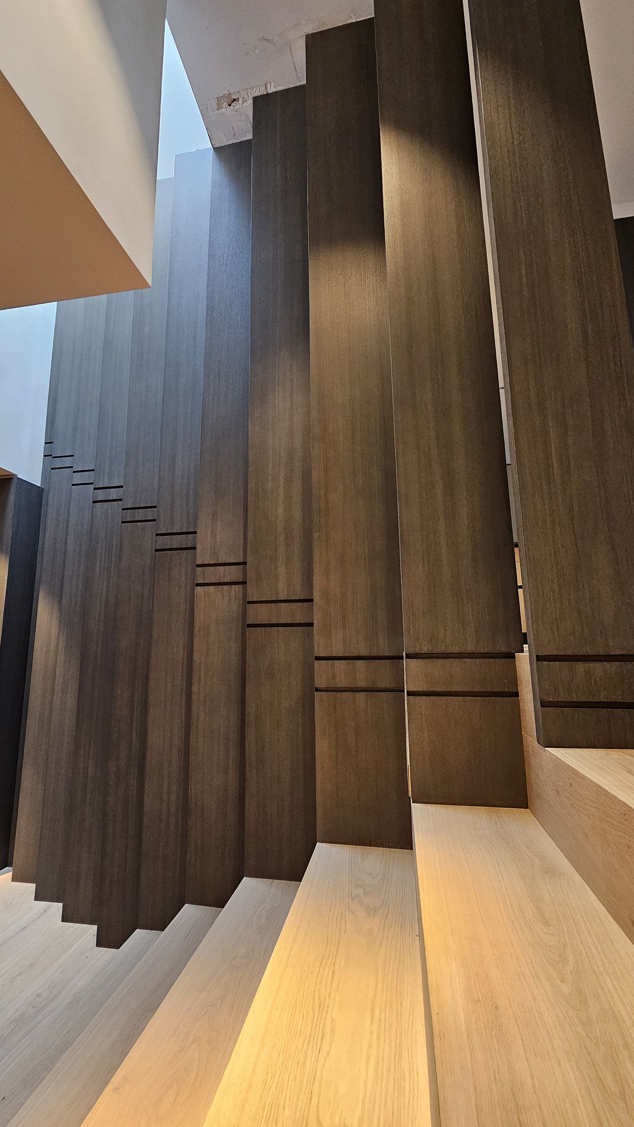 Los tonos claros en los peldaños de las escaleras contrastan sutilmente con los paneles verticales, generando un equilibrio visual elegante y moderno.