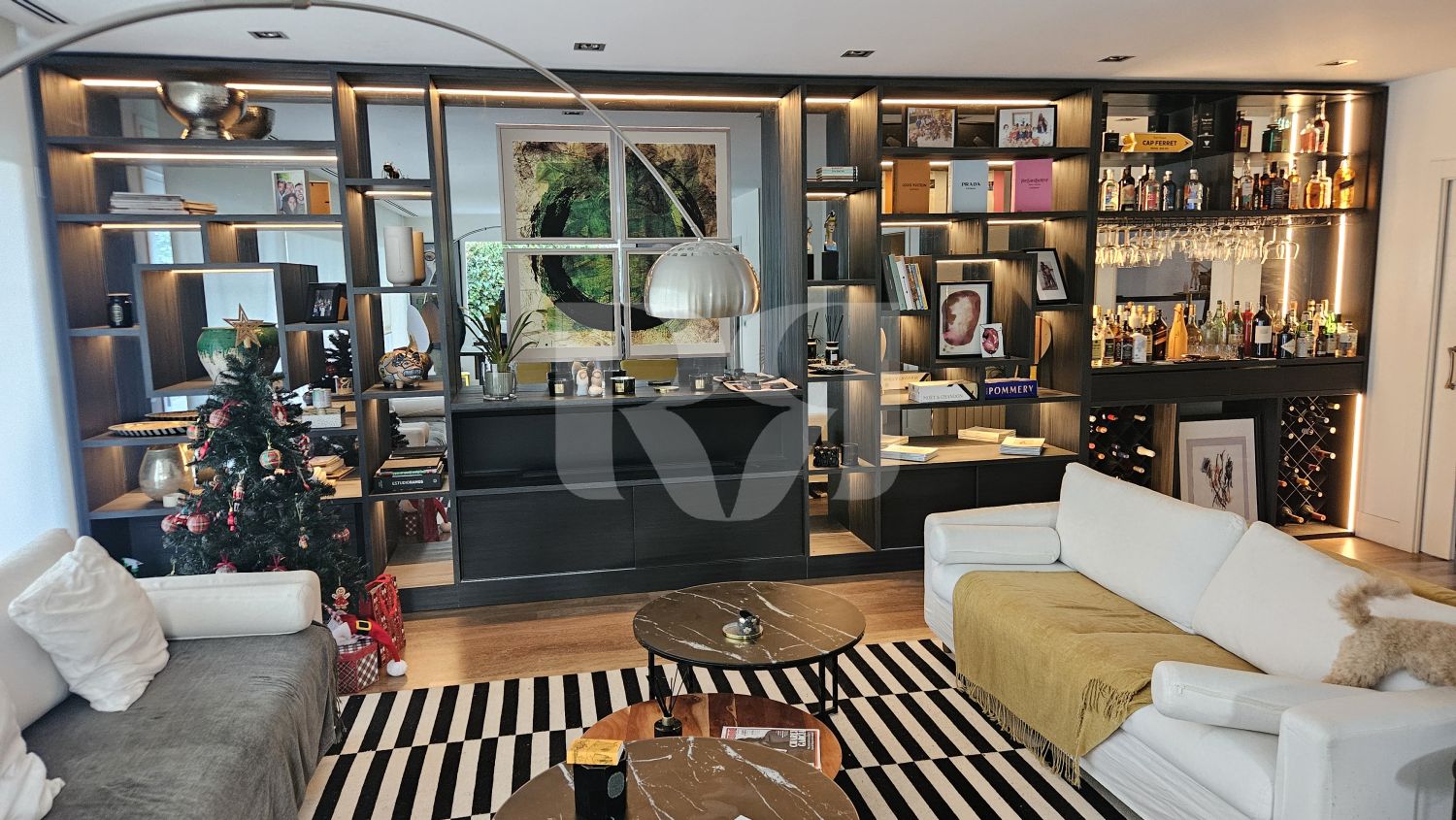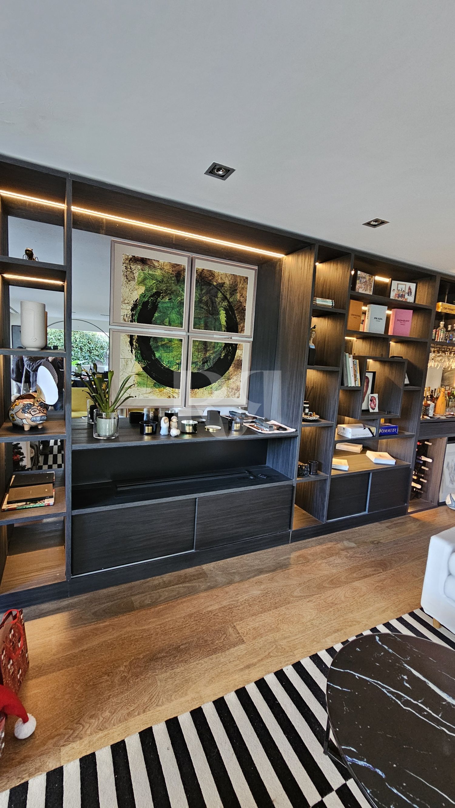 gran librería a medida con mueble bar integrado, concebida como pieza protagonista del salón.
